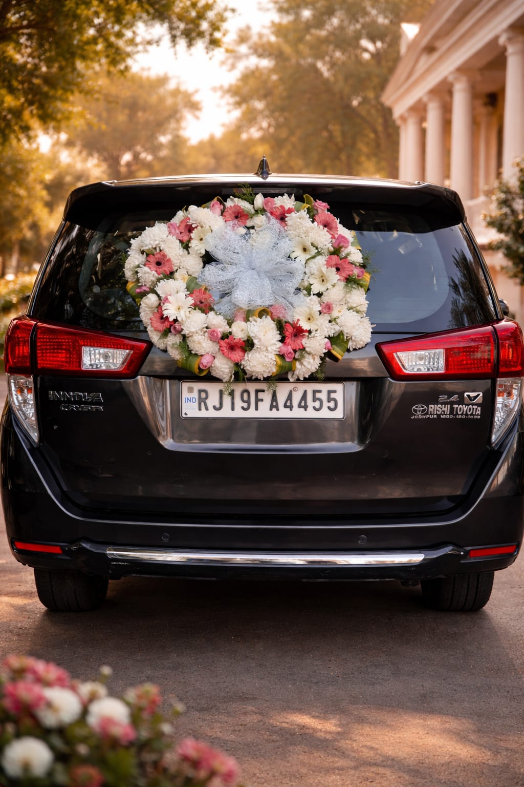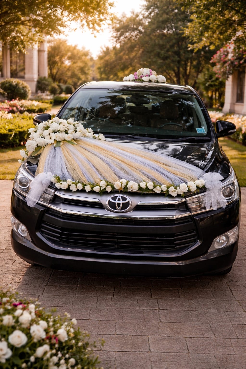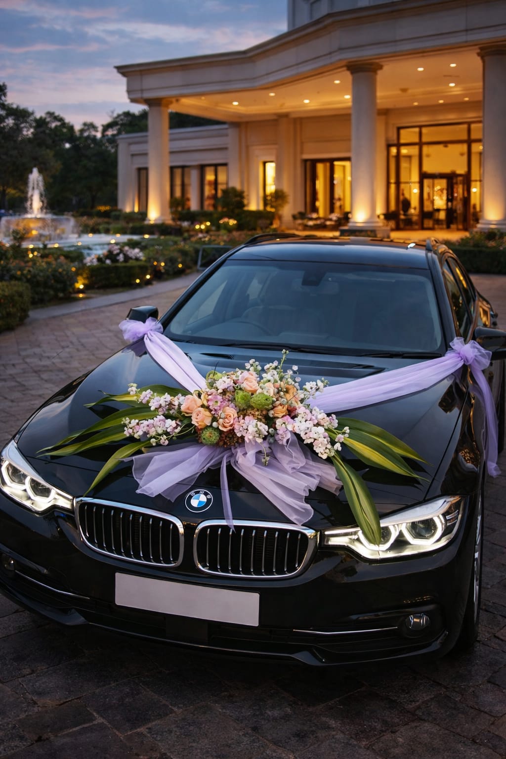 A premium wedding car decoration set on a luxury black BMW sedan. The arrangement is designed with a sophisticated, romantic aesthetic, making it an ideal choice for wedding