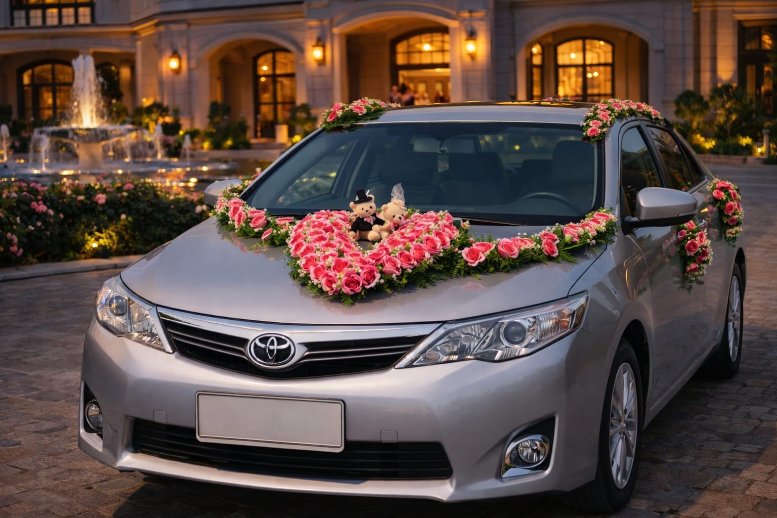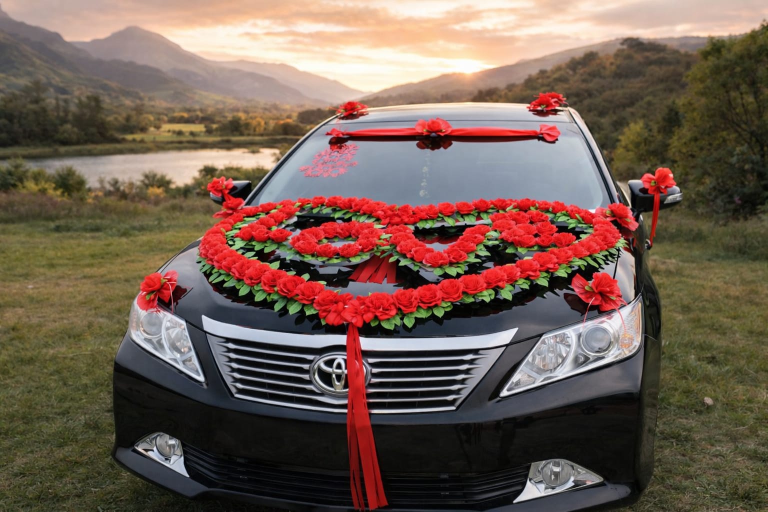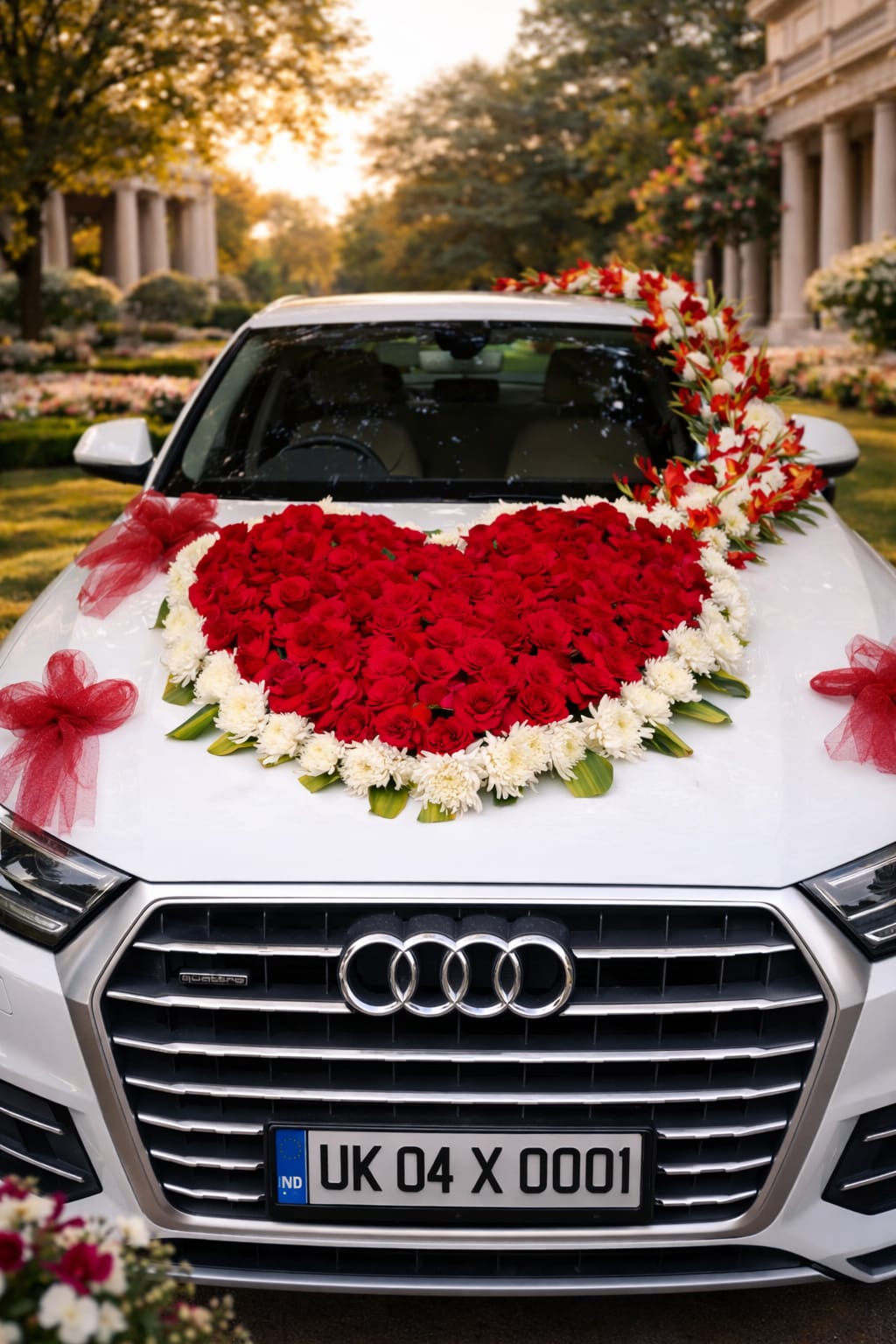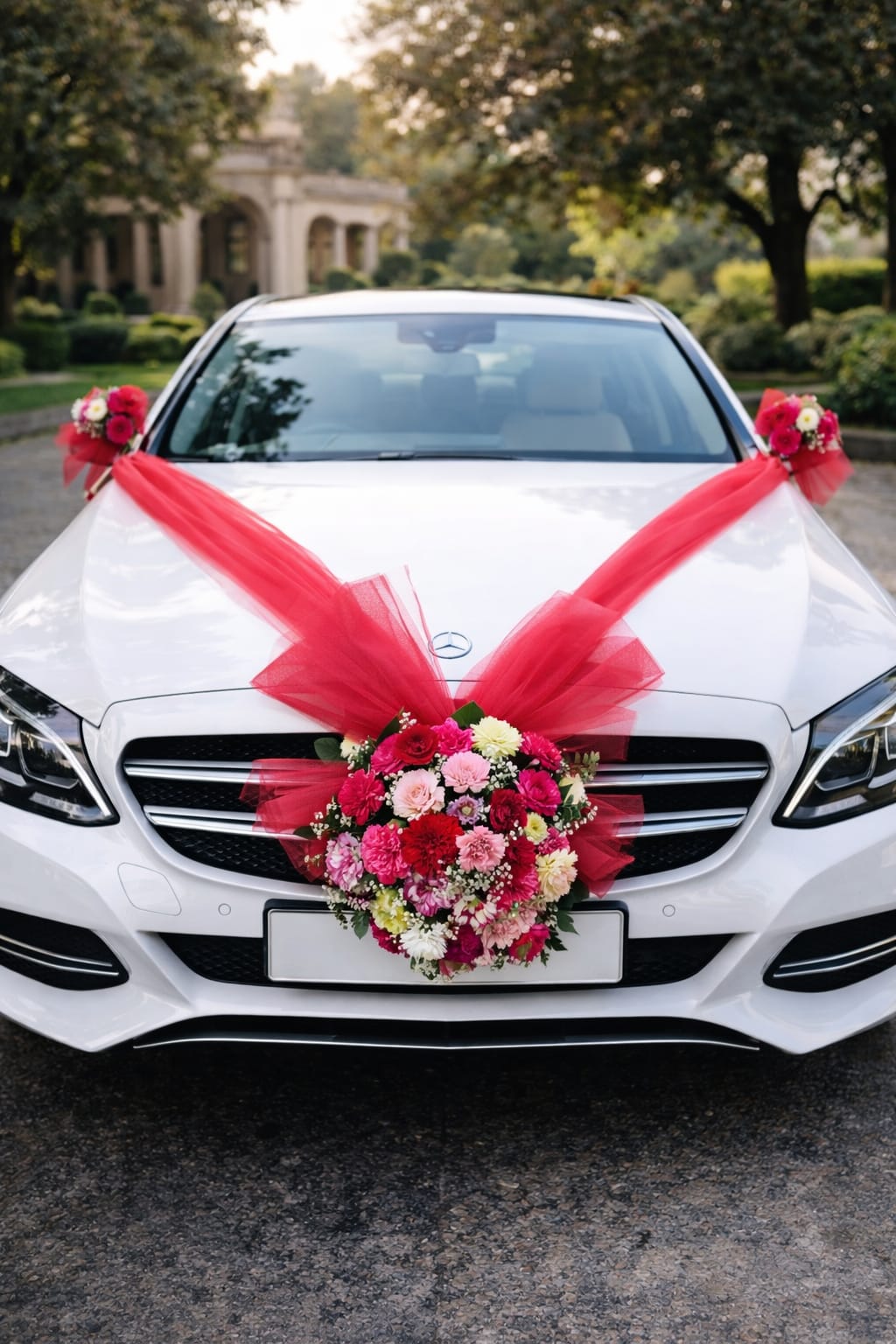 "Front view of a white luxury Mercedes-Benz sedan decorated with a large V-shaped floral arrangement of red carnations, green pom-poms, and blue orchids for a wedding ceremony."